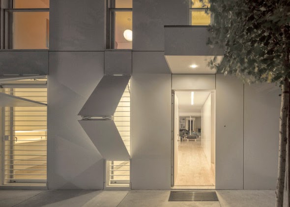 Paneles abisagrados discretamente integrados en la fachada de esta casa protegen la propiedad cuando los dueños no están.